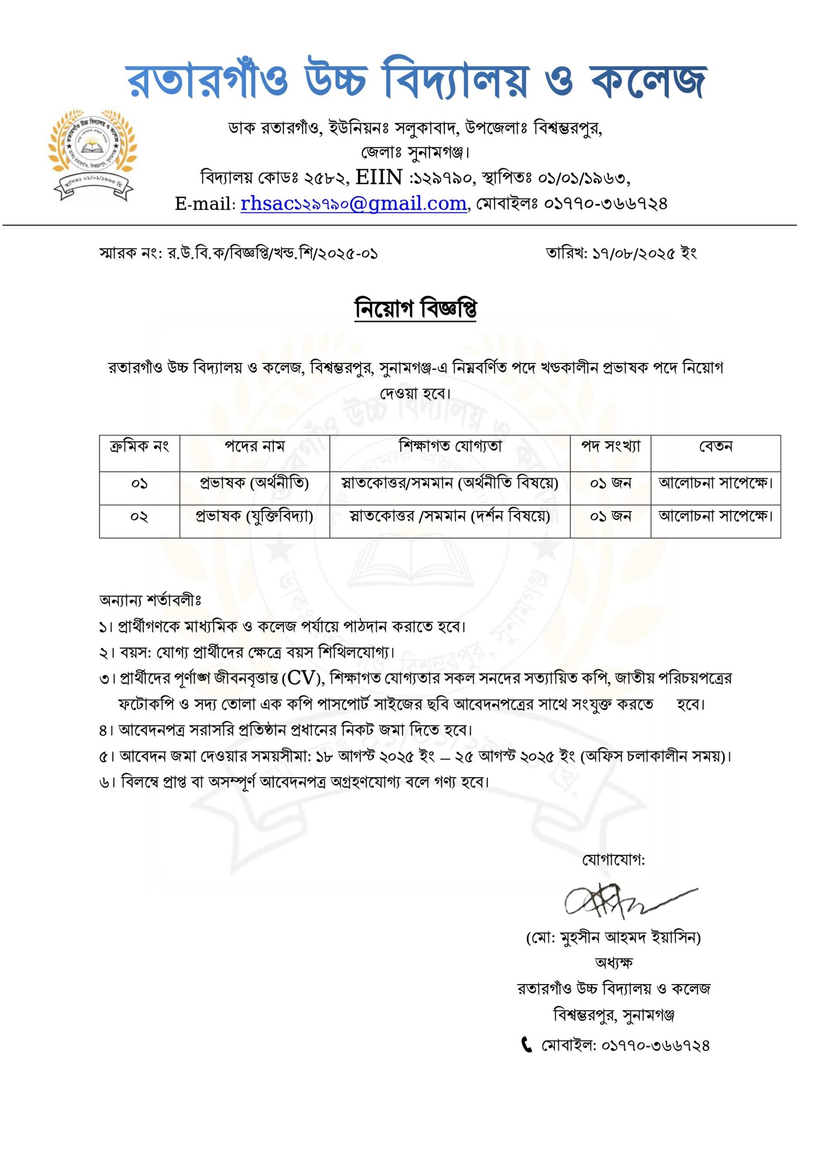 রতারগাঁও উচ্চ বিদ্যালয় ও কলেজ, বিশ্বম্ভরপুর, সুনামগঞ্জ-এ নিম্নবর্ণিত পদে খণ্ডকালীন প্রভাষক পদে নিয়োগ বিজ্ঞপ্তি।